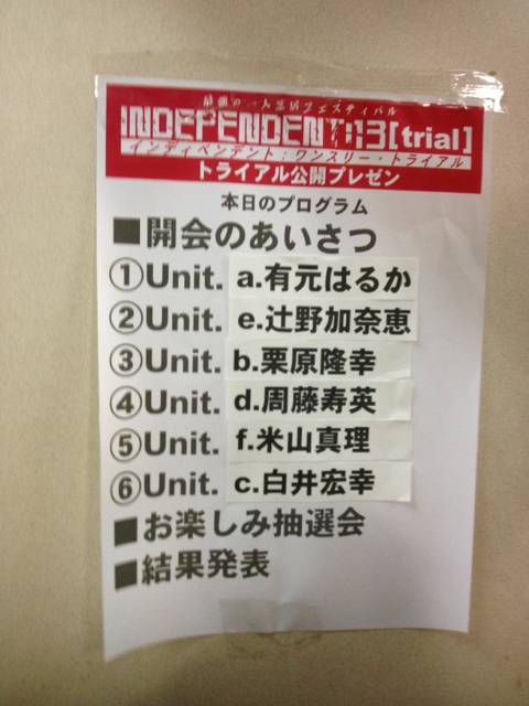 トライアル三次予選、終了致しました。 ご来場下さった皆様、ありがとうございました。 わたしの力及ばず、突破はなりませんでした。 応援して下さった皆様、ありがとうございました。 いわゆる賞レースといいますか、勝敗が明確に出ることを これまでの演劇生活の中でやったことがなかったのもので、 二次突破の歓喜と、三次落選の地獄。 34歳にして、こんなに感情がガクガクなる経験も そうそうできないことだよなあと思っております。 で、こういう経験ってなるべく若いうちにするべきですね。 受ける衝撃に心身がついていかないんですよ。ヒャー。 終わってからの面会や、ツイッターとかで、 ありがたいことにたくさんの人から、いろんな言葉を頂きました。 その言葉ひとつひとつと、 皆さんのその時の、もう何て声かけたらいいのかわからない顔を思い出すたびに もれなく泣いているので、今日はほんと仕事になりませんでした。 電話口で「あ、有元の有は有る無しの有で、元は元気の元です」とか 泣きながらしゃべってて、我ながら何をやってるんだろうと思いました。 少し自分のことを書きますと。 緊張しすぎて何やってるのか全然把握できないまま終わった二次予選の時より、 三次予選の方が比較的落ち着いてまして。 今までやってきたことをちゃんと出せた、という感覚があったんです。 なので、勝てなかったことについては、そりゃあ体が引き裂かれる思いですが、 三次予選で自分がやった芝居にそれほど後悔はないのです。 あれで勝てないなら、それはもうそういうもんです。 いや、それでもやっぱり、死ぬほど悔しいですけどね! キー!!!!! 周藤くん&大西さん、ヨネマリちゃん&勝山くん、突破おめでとうございます。 ますます作品を磨き上げて、11月にギャーンとやらかして下さい。 楽しみにしています! 匿名劇壇の福谷くん。 むちゃくちゃなスケジュールなのに、一緒に戦ってくれたこと、ほんとに感謝してます。 Twitterでもちらっと書いたんですが、二次予選突破したとき、福谷くんが 「三次予選は有元さんと僕で勝ちましょう」と書いてくれてて、 結果、勝てなかったんですけど、終わってから福谷くんが 「試合には負けたけど、勝ってましたよ」って言ってくれて、 彼が上のことを踏まえて言ってたのかどうかはわかりませんが、 私は勝手に、いい感じに受け止めさせてもらいました。 まあ、実際はのとこは、 「あー、あれ、何て言うんでしたっけ?試合に?勝負に? えー、負けたけど?負けてないみたいな?あんな感じっすよ」みたいな言い方でしたが。 みなさん、匿名劇壇、むちゃくちゃ面白いですよ。私が言うまでもないんですけど。 そうそう、この日福谷くんは楽屋階段から落ちて負傷するという事件を起こしたんですが、 彼曰く、先に階段登ってた私がちょっとよろけたせいで落ちたそうなんです。 打ち上げでその話してて、じゃあ有元が怪我させた責任取れみたいな流れになったんですが、 責任の取り方がわからないので、とりあえず女の子を紹介するということになりました。 福谷くんの好みはなんでも言うこと聞く女だそうです。 なので、なんでも言うこと聞く女募集。年齢、容姿は不問。 さて、次は9月! シアターシンクタンク万化「8ビットの日々」! 切り替えて、ガツガツやりまっせー!うらあー! PR お暑い夜ですね、二朗松田です。 下のエントリーで有元も書いてますが、 殿村ゆたか劇場+メロン・オールスターズ 「スローなブギにしてくれって言ったのに」、 誰一人離脱者を出す事無く、無事終了致しました。 皆様、ありがとうございました。 さて、一つイベントが終わる度に このブログでなんやかんや書くのが恒例のようになってましたので、 今回もなんやかんや、 例えば、ネタ解説とか誰からも望まれてない事を書こうかと思ったのですが、 今回の主宰殿村さんが再演やる気満々、 じゃあ直接的なネタバレはやめておこうかなぁ、 と思います。 なので、以下には、 参考にしたヤツのYoutubeを延々貼るという作業に徹しますので、 ご覧になった方、分かる分だけ拾っていって下さい。 殿村ゆたか劇場+メロンオールスターズ 「スローなブギにしてくれって言ったのに」無事終了いたしまして。 ご来場の皆様、まことにありがとうございました! 普段なかなか関わることのできない、すごい方々とご一緒できて、 本当に楽しい座組でありました。 誘って下さった殿村さん、ありがとうございましたー! 「俺の中に氷室がいないんだよ!」は今回イチの名言でした。 回を追うごとに上達していくKISS ME、素晴らしかったです。 歌姫、西原希蓉美嬢。 前から仲良くさせてもらってたけど、ガッチリ絡むのは今回が初めてでした。 出ずっぱり喋りっぱなし歌いっぱなしなのに、 全く失速しない彼女のタフさ加減にただただ感服!! 稽古後の飲み会レギュラー参加の津久間泉ちゃん。(しまった写真撮り損ねた) 私が着てたセーラー服は泉ちゃんの私物でして、 泉くん